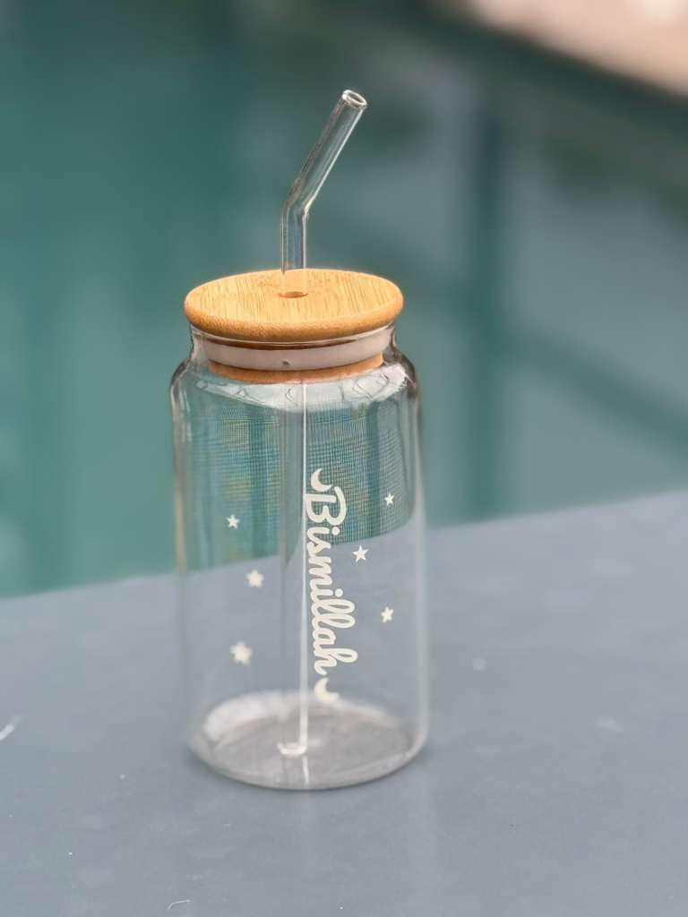Stay refreshed and inspired with our Bismillah Glass Tumbler — a perfect blend of elegance and faith. Made from high-quality glass with a sleek “Bismillah” design, it’s ideal for your daily drinks, smoothies, or iced coffee.